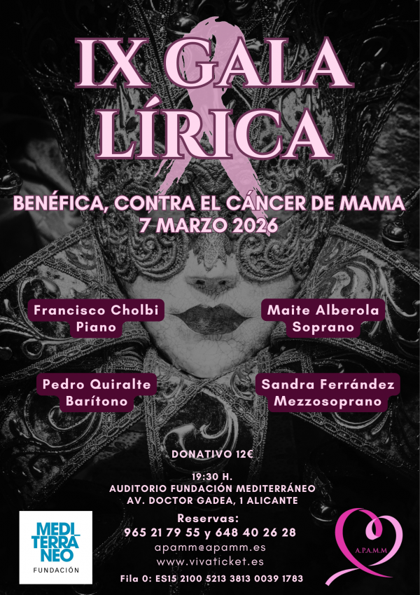 Con motivo del Día de la Mujer, la Asociación Provincial de Alicante de Mujeres con Cáncer de Mama, A.P.A.M.M, organiza un CONCIERTO SOLIDARIO el sábado, 7 de marzo, en el Auditorio del Aula de Cultura de Alicante, Fundación Mediterráneo, Av. Doctor Gadea, 1. La sala abrirá