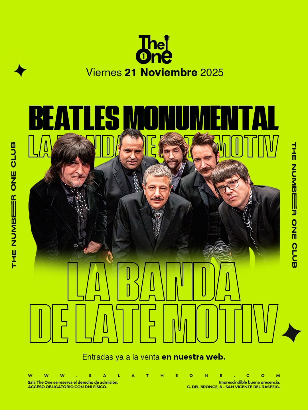 Alicante se prepara para revivir la magia de los Fab Four con “Beatles Monumental”, el espectáculo creado por La Banda de Late Motiv, que llegará en directo a La Sala The One el próximo 21 de noviembre. Un concierto único que conmemora el 60º aniversario de la histórica visita de The Beatles a Madrid y Barcelona en 1965.