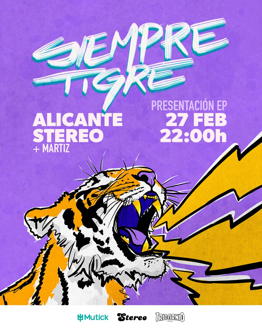 Paralelamente, Siempre Tigre debutó en directo el pasado 11 de octubre en “Ciudad Oasis” formando parte la programación del Oasis Elche Music Fest organizado por Producciones Baltimore. Posteriormente, el 22 de noviembre, hicieron en Madrid y junto a Nuevo Berlín el que fue su primer concierto antes de presentar oficialmente su primer EP el pasado 7 de febrero en Madrid, y el próximo de 27 de Febrero en Sala Stéreo de Alicante.