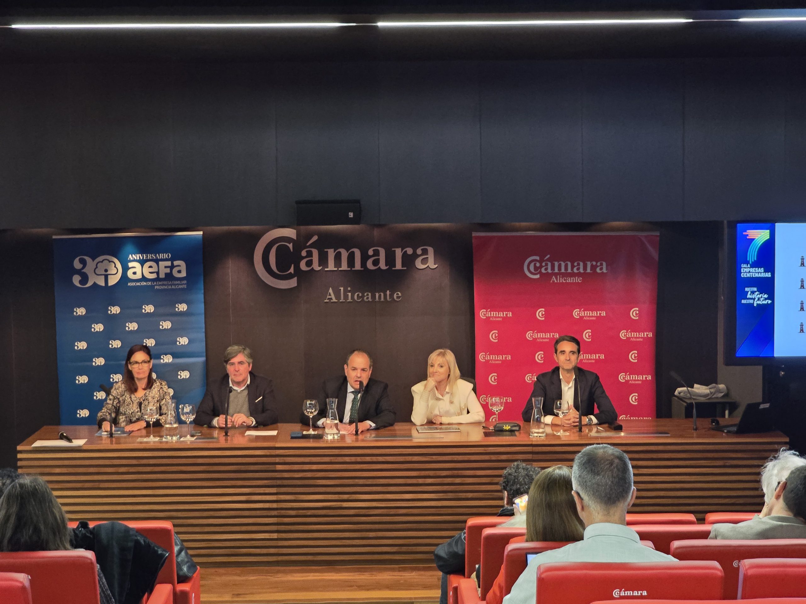 El presidente de la Cámara de Comercio de Alicante, Carlos Baño, la presidenta de la Asociación de Empresa Familiar de la provincia de Alicante (AEFA), Maite Antón, el director territorial de Cajamar, Manuel Nieto, y el diputado provincial de Desarrollo Económico y Proyectos Europeos, Carlos Pastor y Elisa Diaz, jefa de servicio de empleo y fomento del Ayuntamiento de Alicante, han presentado esta mañana en rueda de prensa la séptima edición de esta gala.